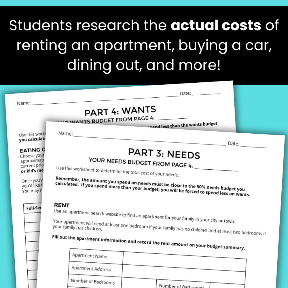 This fun budgeting project incorporates personal financial literacy and real-world math skills! Students will learn to create a realistic budget for their needs, wants, and savings and will research the real costs of everyday expenses.