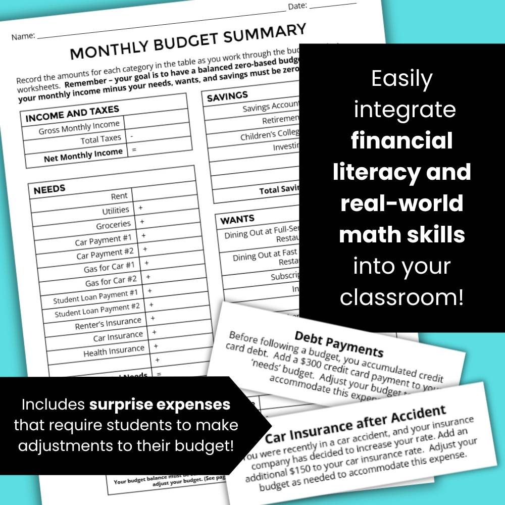 Easily incorporate financial literacy and real-world math skills into your classroom!  This fun financial literacy budgeting project will give students experience setting up a family budget while helping them understand life expenses—including rent, car payments, eating out, and more!