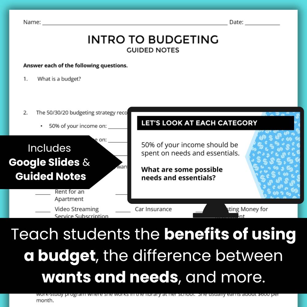 The Google Slides and Guided Notes included in this lesson will teach students about the importance of a budget and how to implement a 50/30/20 budget. Students will also be presented with budgeting scenarios where they will analyze whether budgets are following the 50/30/20 guidelines and suggest ways to adjust various budgets.