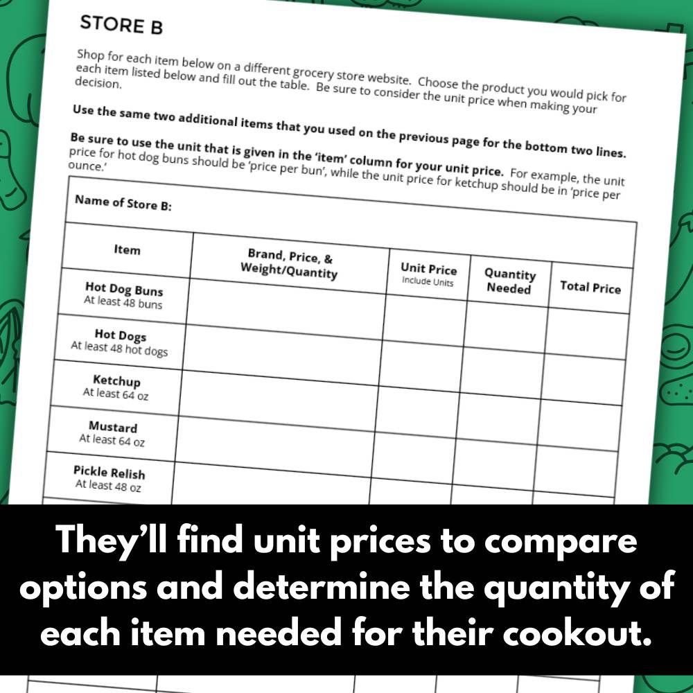 Practice comparison shopping using unit prices with this real-world math activity! Students will use grocery store websites to find items needed for a cookout shopping list, calculate unit prices, quantity needed for 24 people, and more!