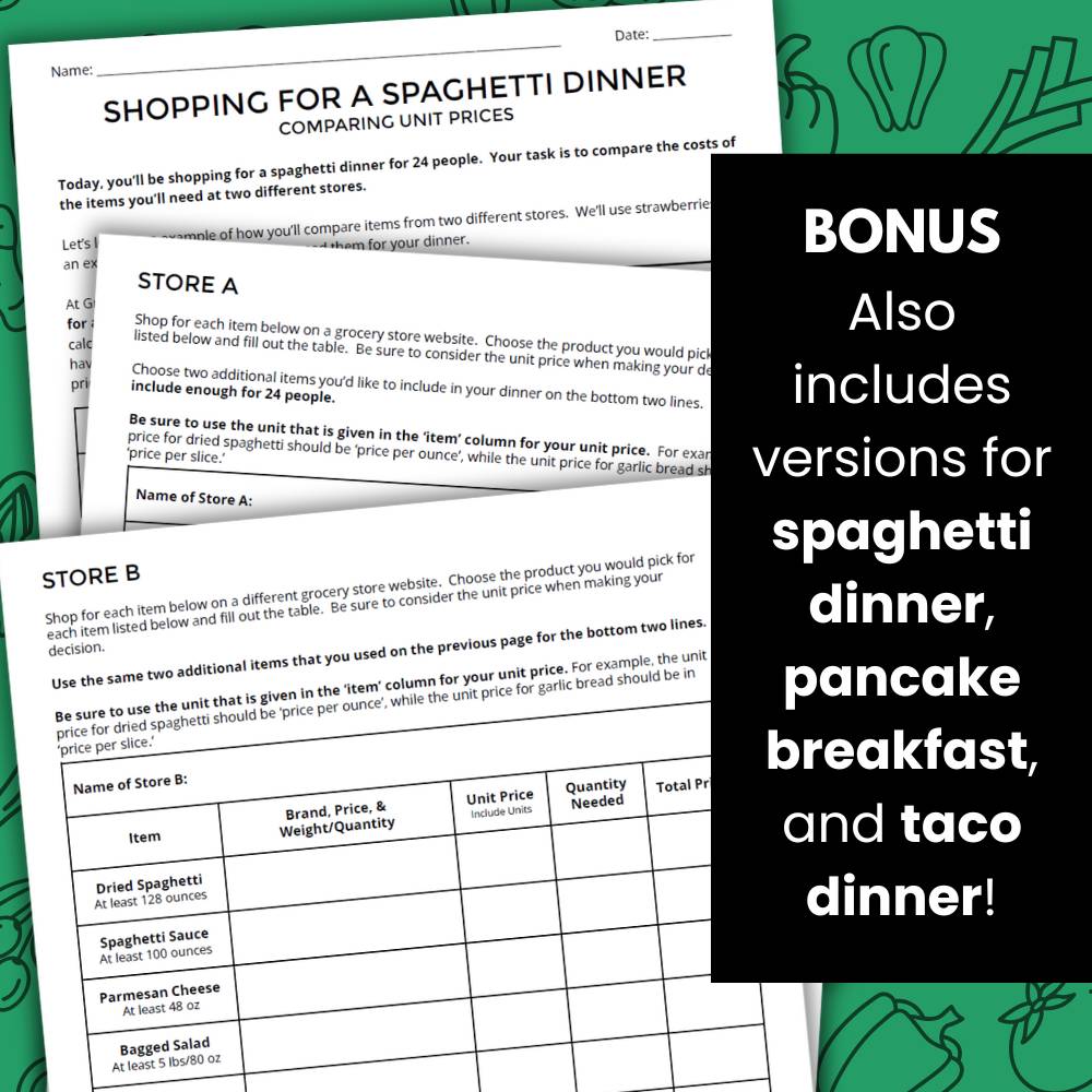 Practice comparison shopping using unit prices with this fun activity!  Also includes 3 alternate versions for spaghetti dinner, taco dinner, and pancake breakfast.
