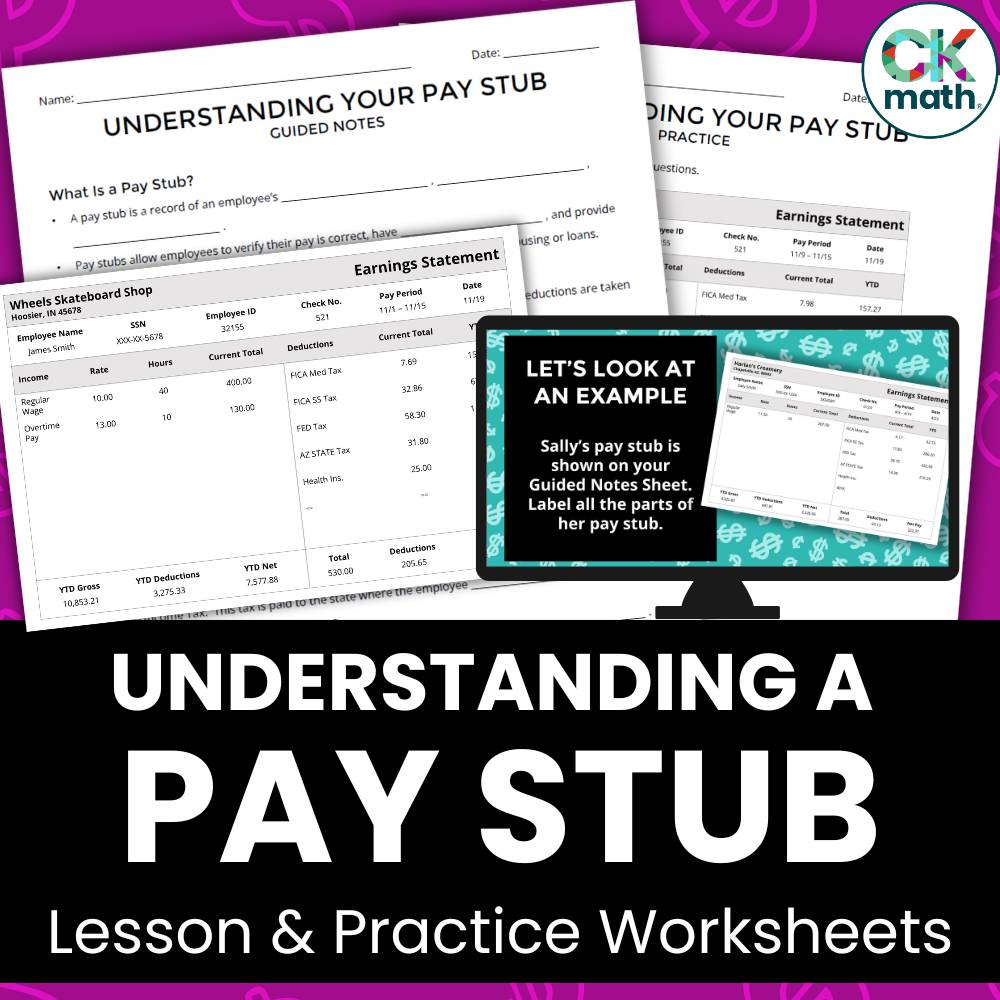 Students will learn how to read and interpret the information provided on their pay stubs using realistic sample pay stubs. You will lead students through the guided notes using the included Google Slides. Students will learn about each part of a pay stub, including related vocabulary, as they fill in the blanks on the notes. Students will then practice their knowledge independently or in pairs on a practice worksheet.